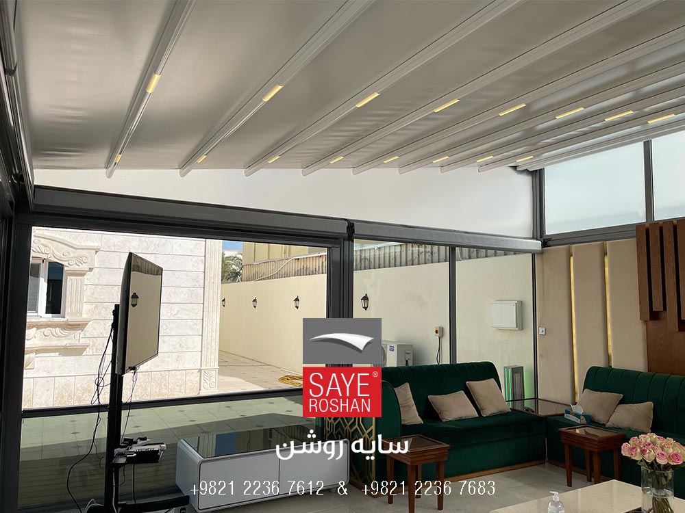 شامل : یک عدد سقف متحرک پارچه ای به ابعاد 6 متر*6 متر – یک عدد شیشه اسلایدینگ – دو عدد پنجره گیوتینی