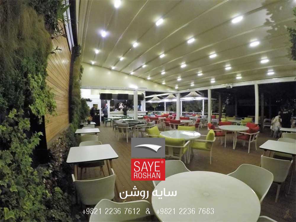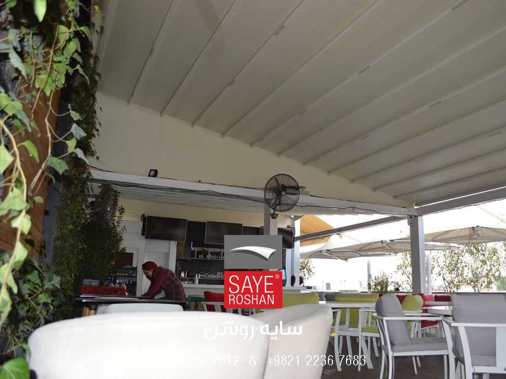 سایبان برقی بام رستوران : سطح سایبان برقی رستوران با استفاده از پارچه رنگ روشن از برند مهلر آلمان تولید شده است. تمامی تیغه های میانی همرنگ پارچه انتخاب شدند تا سطح سقف شباهت بیشتری با بادبان کشتی داشته باد. در همه سیستم های سقف متحرک سایه روشن، قسمت دپوی پارچه و باکس موتور با پنل پوشیده می شود. تا در مواقع جمع بودن سقف، باکس موتور و پارچه های جمع شده محفوظ باشند. دراین پروژه این پنل پارچه و سازه همه همرنگ نما اجرا شده اند و ترکیبی بسیار زیبا را رقم زدند.