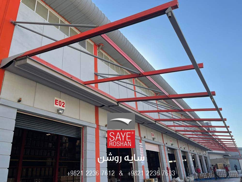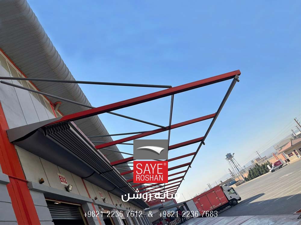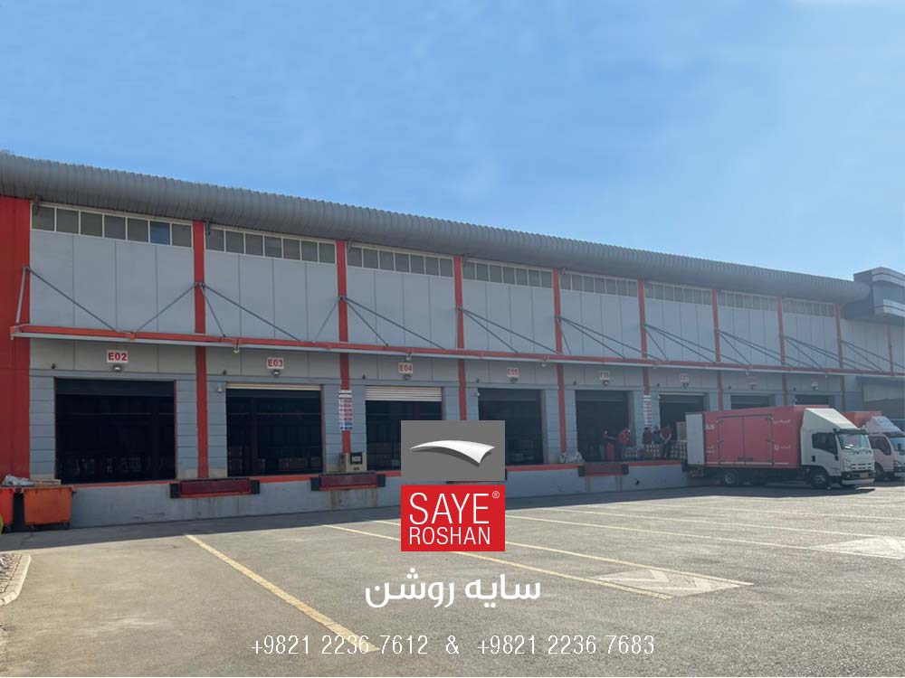 ستون گذاری در جلو بار انداز برای کامیونها و لیفتراکها یک مزاحمت بود. در طرح مهسایه سقف متحرک پارچه ای به ستونهای اصلی بدنه سوله متصل شدن و با توجه به اینکه طول ریلها بلند بود با کمک دستکهای مورب توانستیم به راحتی یک طره ای 6 متری را اجرا نمائیم. انبار شرکت گلدیران در جاده قدیم قم در منطقه شورآباد واقع شده است.