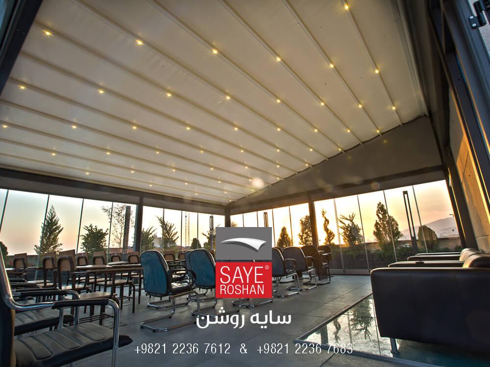 در این پروژه برای جلوگیری از تابش نور خورشید به داخل اتاقک شیشه ای از پرده های کابلی و زیپ پرده استفاده شد