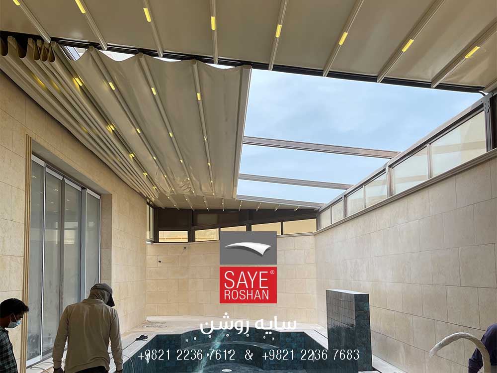 ساختار سازه ای سقف متحرک پارچه ای : با توجه به موجود بودن دیوار در چهار جهت سقف استخر، نیازی به کارگزاری تکیه گاه نبود. با استفاده از تیر موجود در نما، سقف را از سمت موتور به تیر متصل کردیم و سر دیگر ریلها به همراه آبراه بر روی لبه دیوار قرار گرفت.
