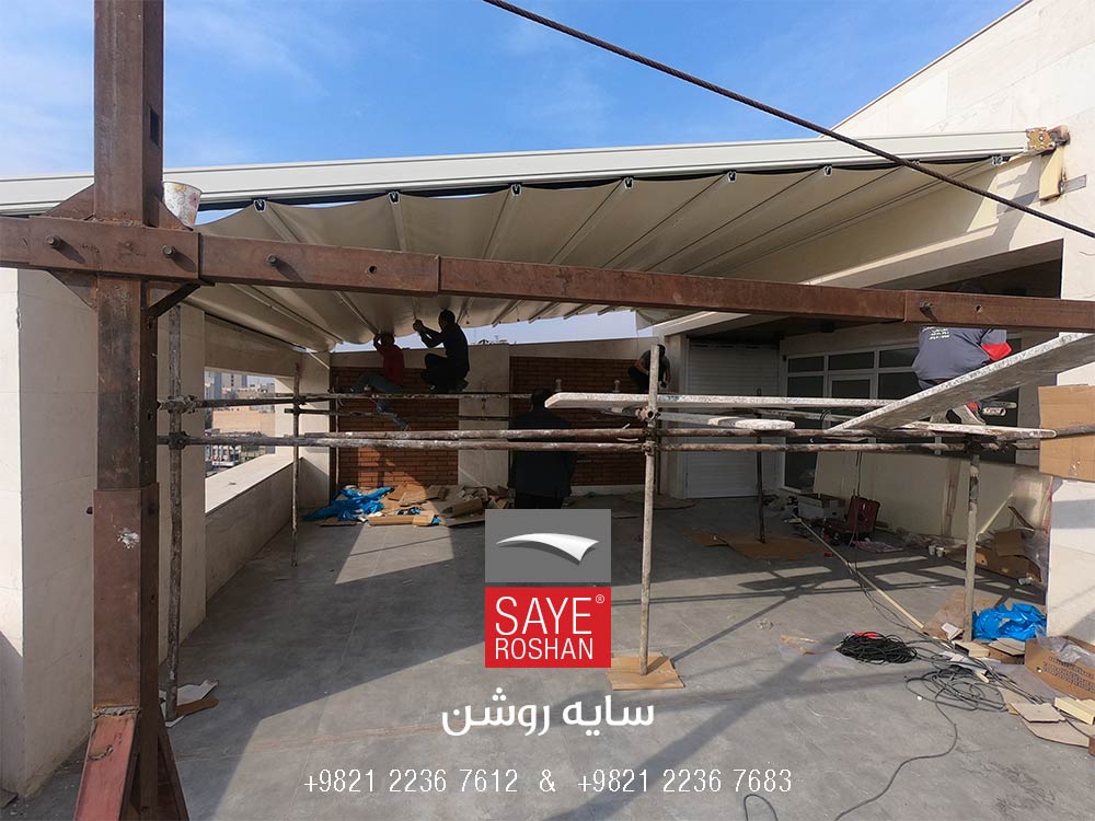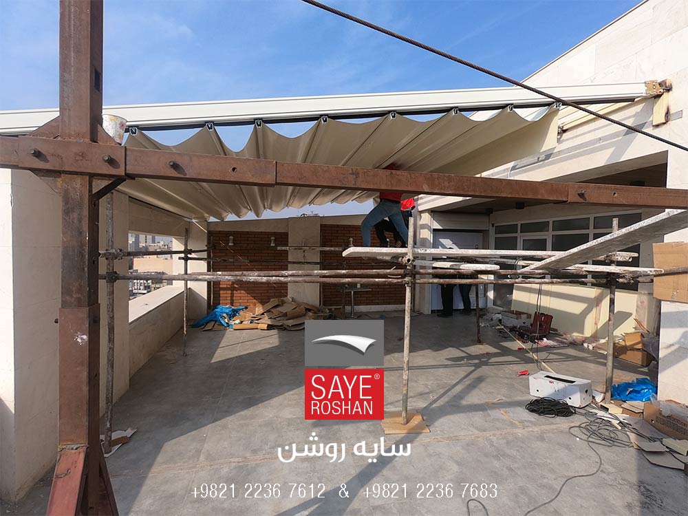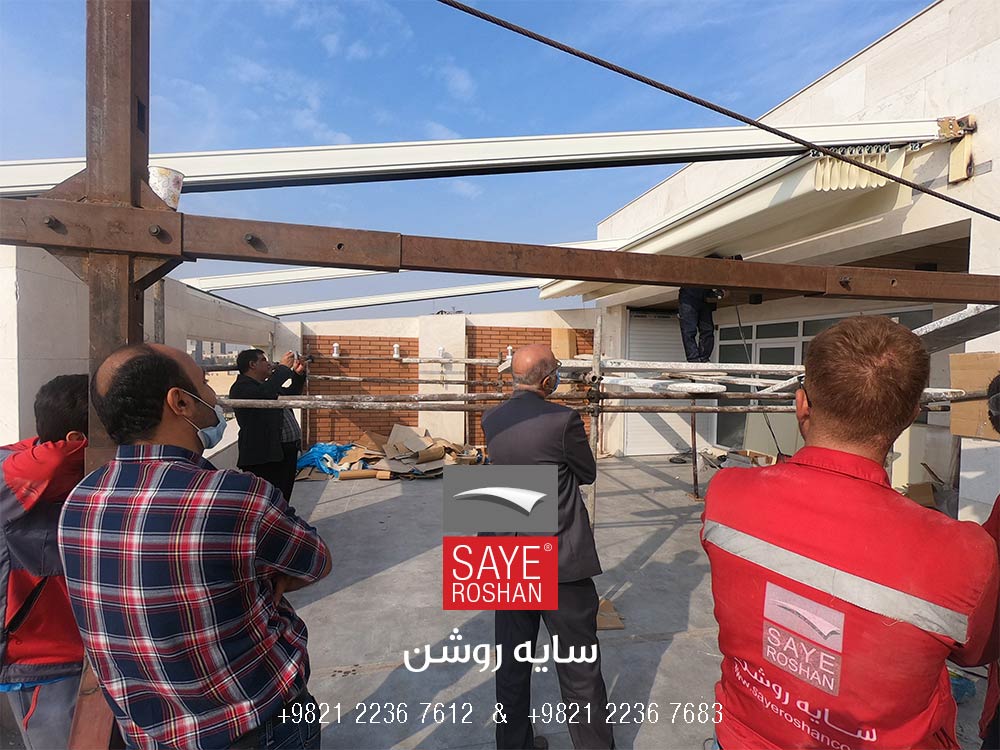 ساختار سازه ای سقف متحرک : ساختار سازه ای این پروژه که در اهواز اجرا گردیده سایانه میباشد که یکی از متداولترین و پرکاربردترین سازههای سقف متحرک است. در این نوع سایبان، سقف از طریق اتصال به سازه ساختمان و ستونهایی که در قسمت جلویی نصب شدهاند، پایدار میشود. این ستونها علاوه بر نقش نگهداری و پایداری، مسیر تخلیه آب باران نیز هستند.