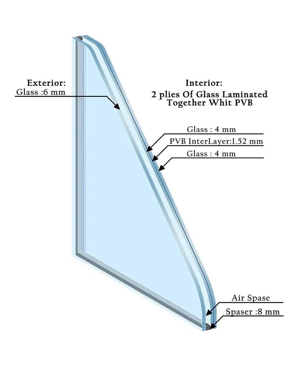 شیشه لمینت، شامل دو یا چند لایه شیشه است که توسط نوعی طلق به هم پرس شده و میچسبند. این طلق پلیمری، PVB (پلی وینیل بوتیرات) نام دارد که تحت فشار و حرارت ساخته میشود و مانند یک چسب محکم عمل میکند. با توجه به خاصیت چسبندگی بسیار بالای PVB، در اثر شکست قطعات شکسته شده بر روی لایه PVB باقی مانده و فرونمیریزند.در واقع شیشه لمینت، نوعی شیشه ایمنی است که در هنگام بروز ضربه و حادثه، خرد میشود اما قطعات آن متلاشی نمیشوند و از هم نمیپاشند. نکته مهم است که طلق های PVB با لایه های مختلفی در بازار موجود است که پر کاربردترین آن ها در ضخامت های 0.38 و 0.76 و 1.52 میلیمترموجود می باشد. هر چه قطعه شیشه بزرگتر باشد، نیاز به استحکام بیشتری داریم. هر نوع شیشه ای، اعم از شیشه معمولی، سکوریت، ضد گلوله، رنگی، فلوت و …را میتوان برای تولید شیشه لمینت استفاده نمود.
