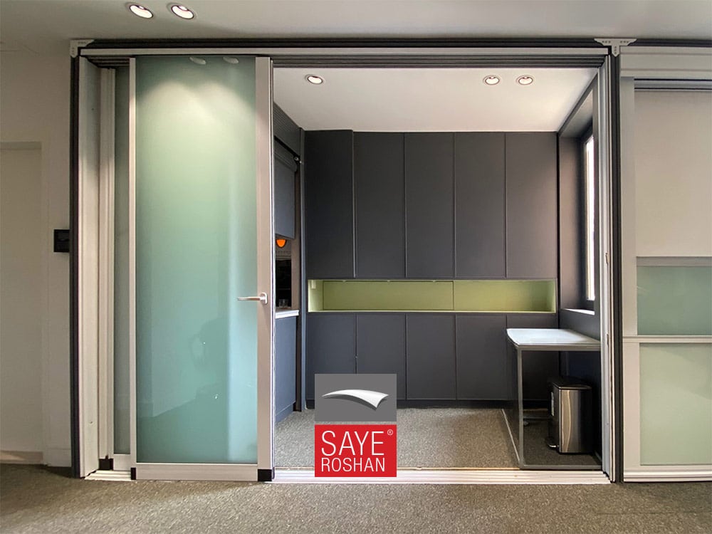 سیستم پنجره اسلایدینگ واحد اداری سعادت آباد به منظور استفاده بهینه و جدا سازی فضای ورودی واحد از آشپزخانه اجرا گردید.