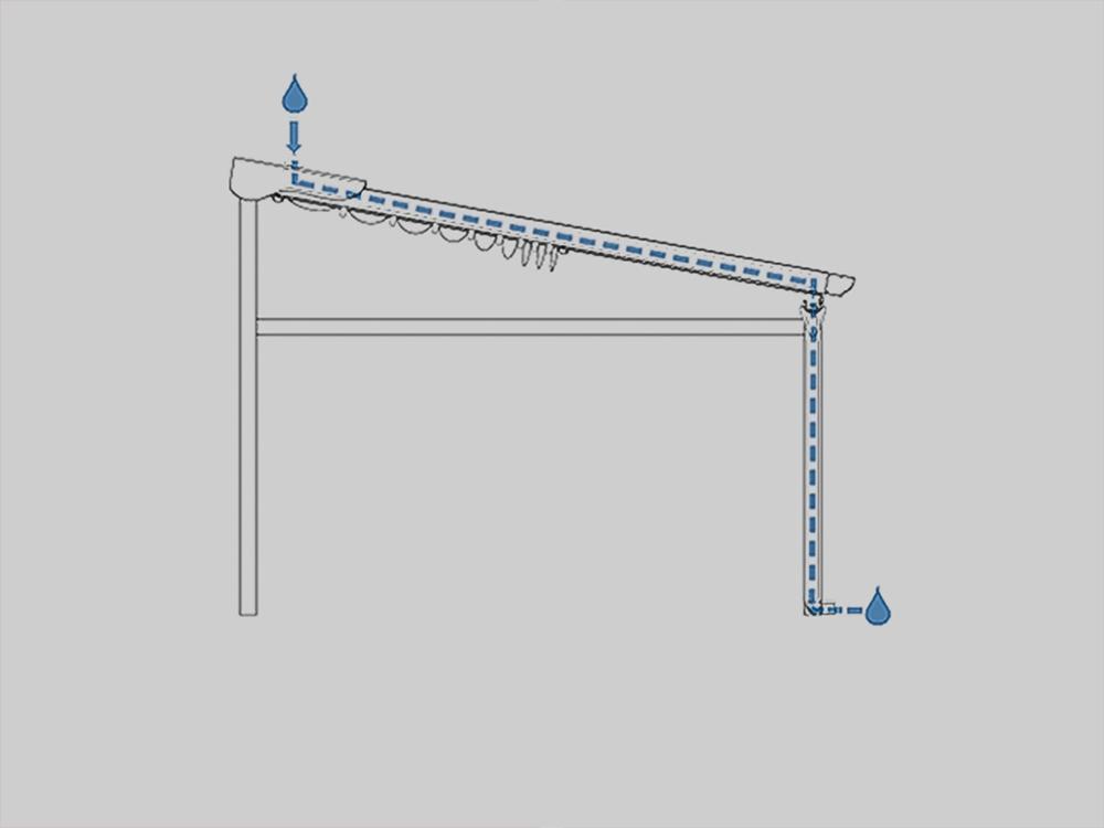 در زمان گسترده بودن پارچه سقف، لبه جلویی پارچه بر روی یک ناودانی آلومینیومی هدایت کننده ی آب قرار می گیرد. آب باران جمع شده در سطح سقف با در نظر گرفتن شیب مناسب از طریق خروجی های این ناودانی عرضی به داخل ستونهای سقف متحرک تخلیه میشود . داخل ستون های سقف لوله هایی 63 میلیمتری از جنس PVC تعبیه شده است. که آب باران جمع شده بر سطح سقف را به سطح زمین و یا مجرای فاضلاب ساختمان بر عهده دارد .