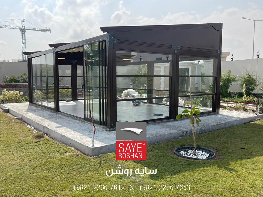 نیاز پروژه: وجود اتاق نشیمن شیشه ای – اتاقک شیشه ای موتورایز – کاملاً هوابند شده با جدارههای شیشه ای برای بهره مندی از منظره بیرونی نیاز اصلی این پروژه بود. با وجود سقف متحرک و پنجره های پاناروما امکان بهره مندی از هوای آزاد با فشردن یک دکمه در هر لحظه امکانپذیراست. اجرای 6 عدد پنجره برقی گیوتینی که 4 عدد گیوتین با ابعاد 2.31 عرض * 2.25 ارتفاع ؛در نمای سمت چپ و راست و 2 عدد گیوتین با ابعاد 3.73عرض * 2.37 ارتفاع؛ در قسمت عقب سیستم این نیاز کارفرما را به راحتی برآورده کرد.